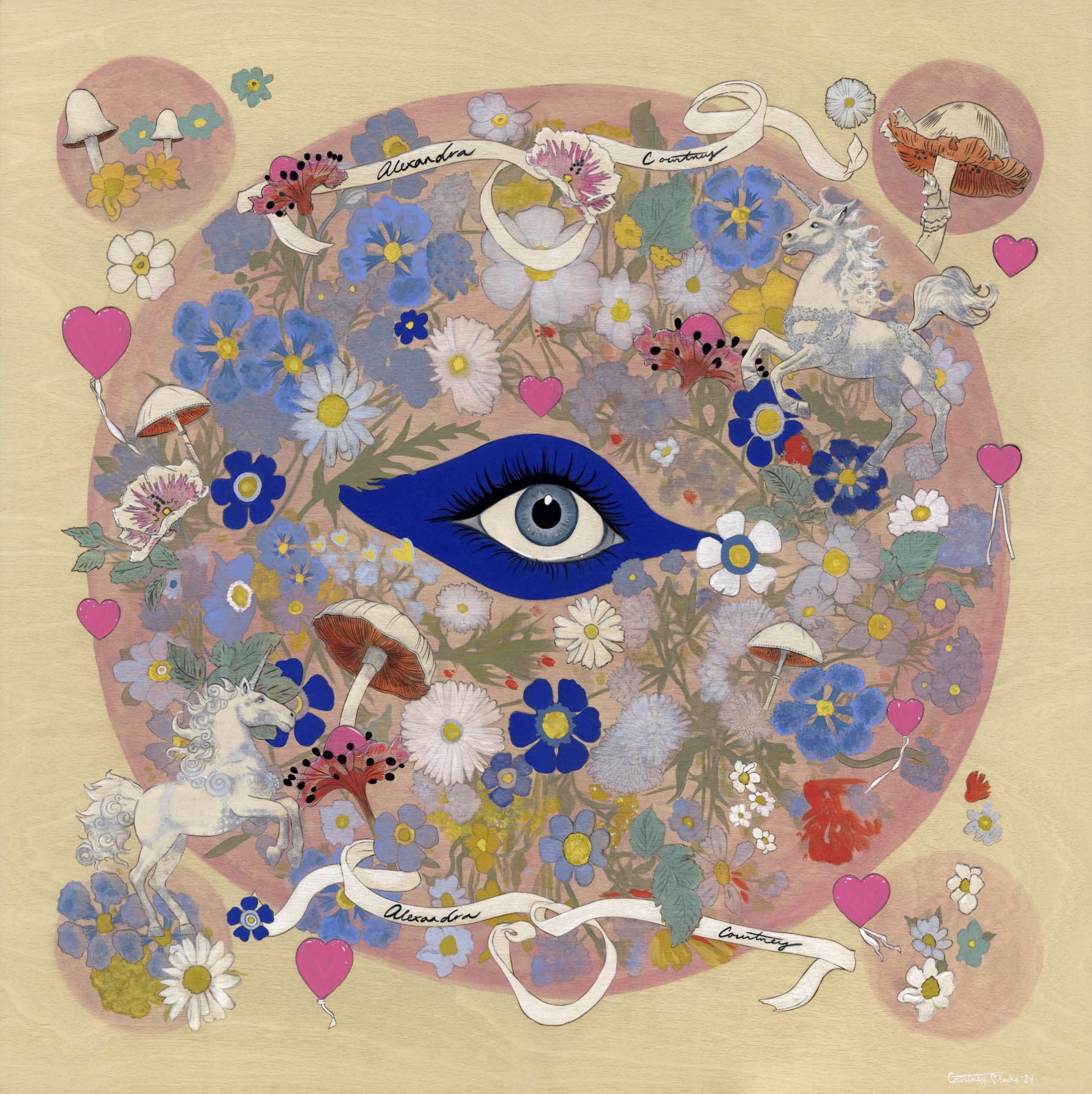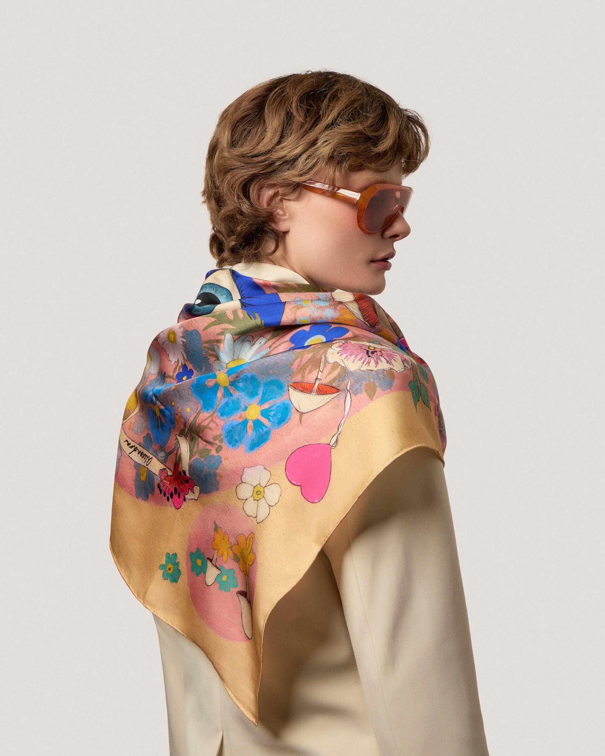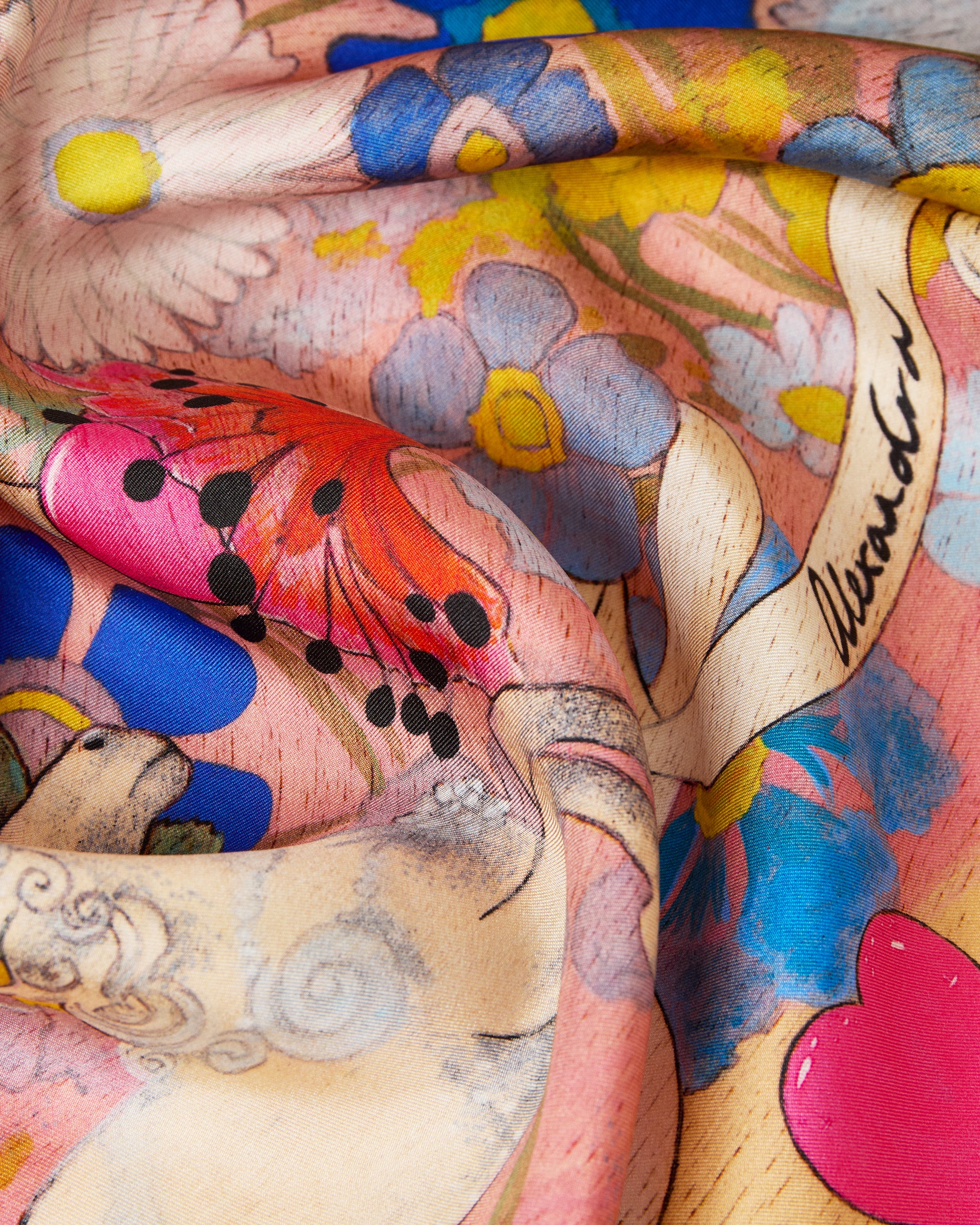 The True Love Silk Scarf is a mystical scarf in a colourful print created in collaboration with talented American artist Courtney Bourke. In tones of pink, blue and cream, this piece is made from a luxurious silk twill printed in England. This scarf is eye-catching and beautiful and is adorned with our signature AH enamelled logo.