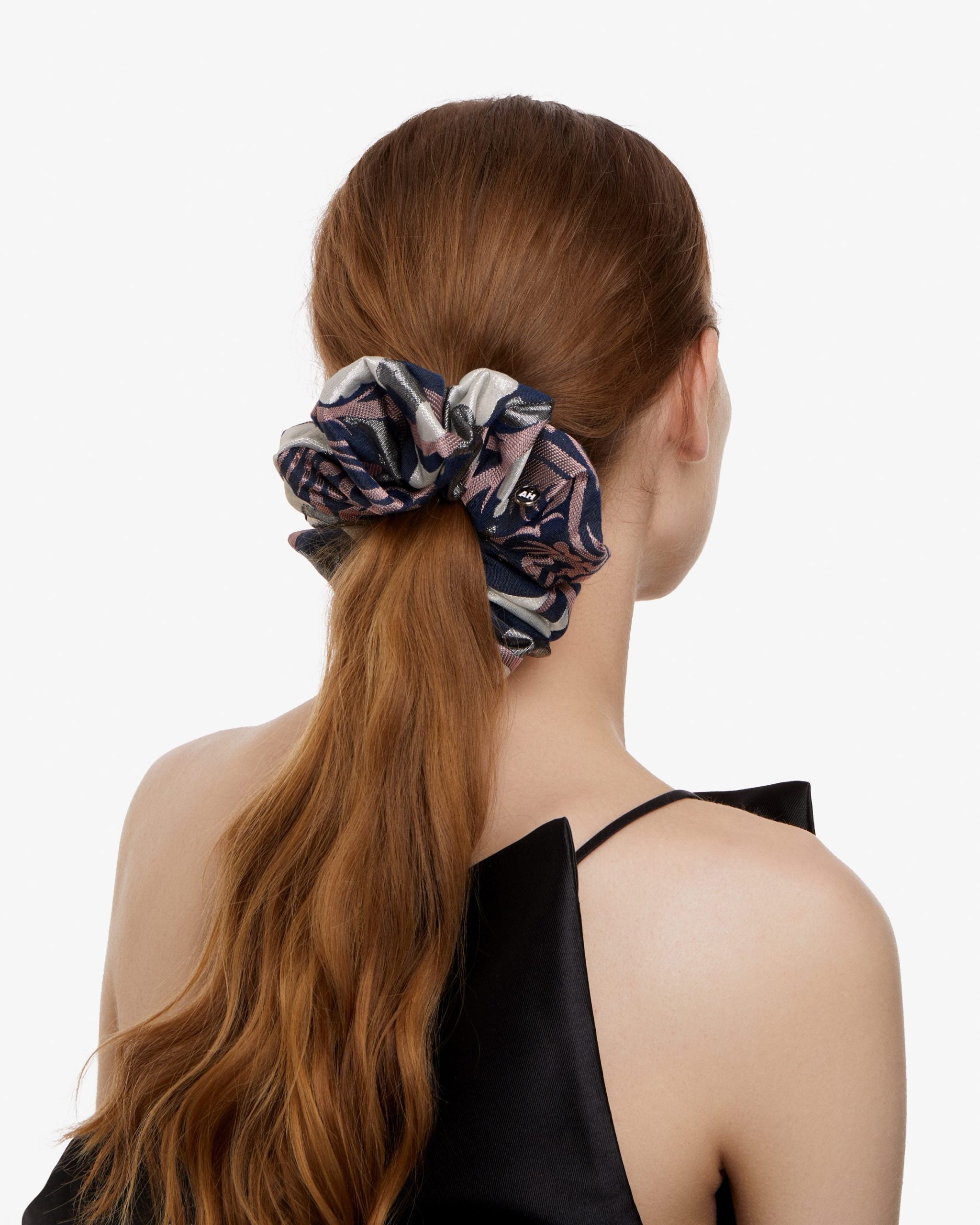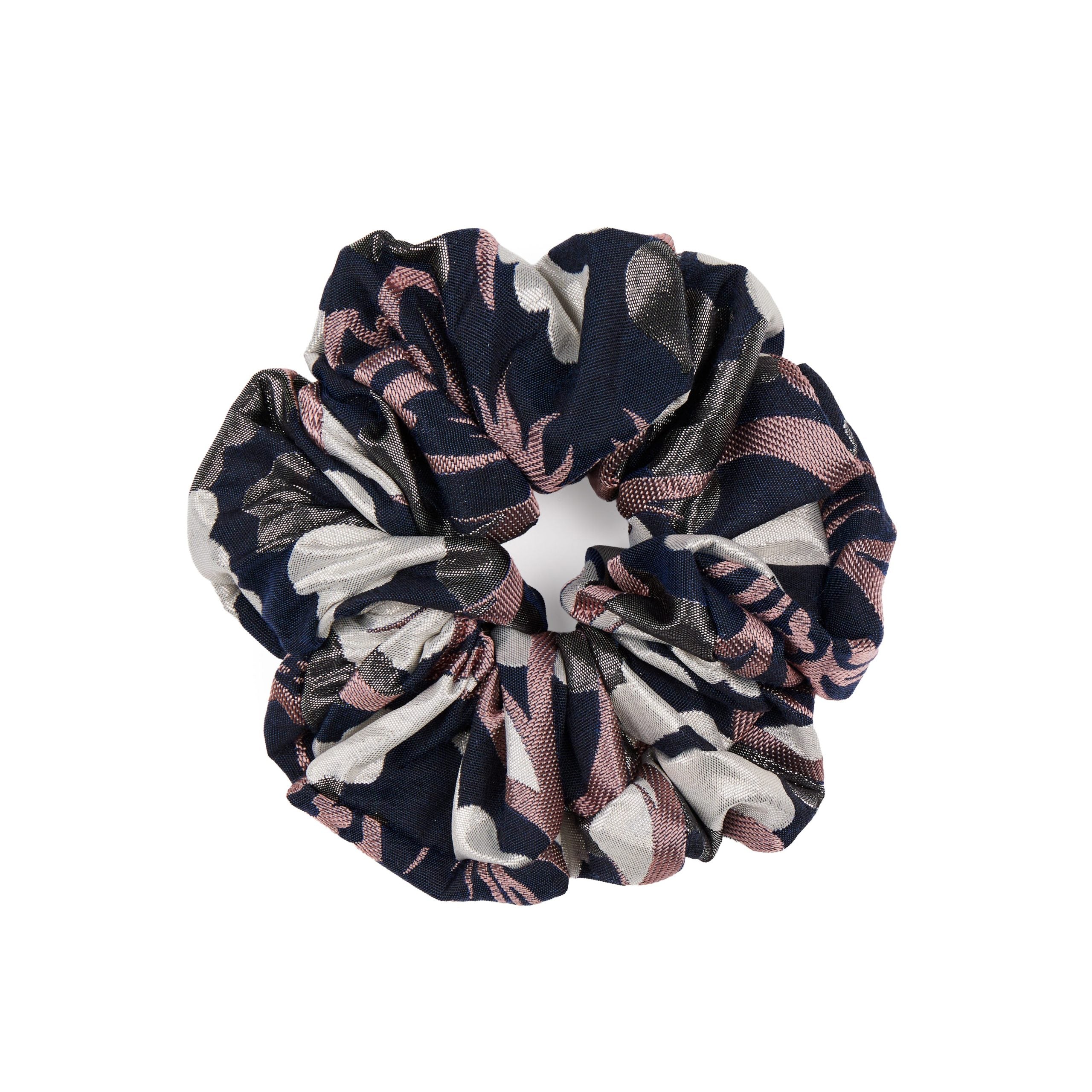 The Galactic Scrunchie is a beautiful and luxurious hair tie in shades of navy blue, pink, cream and silver. Made from a swirling, metallic brocade, this hair band is full and dramatic. Adorned with our signature AH enamelled logo.