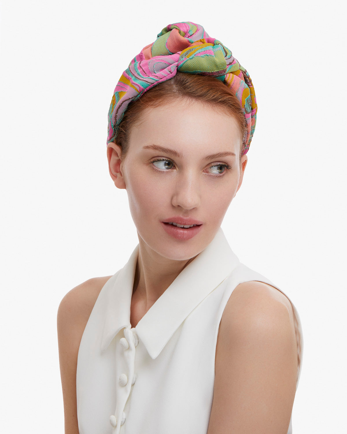 The Have A Good Trip Knotted Headband is a double-width, knotted headband in a vibrant pink and green print. Made from a luxury brocade fabric, this unique accessory is an instant glamour boost. Adorned with our signature AH enamelled logo.