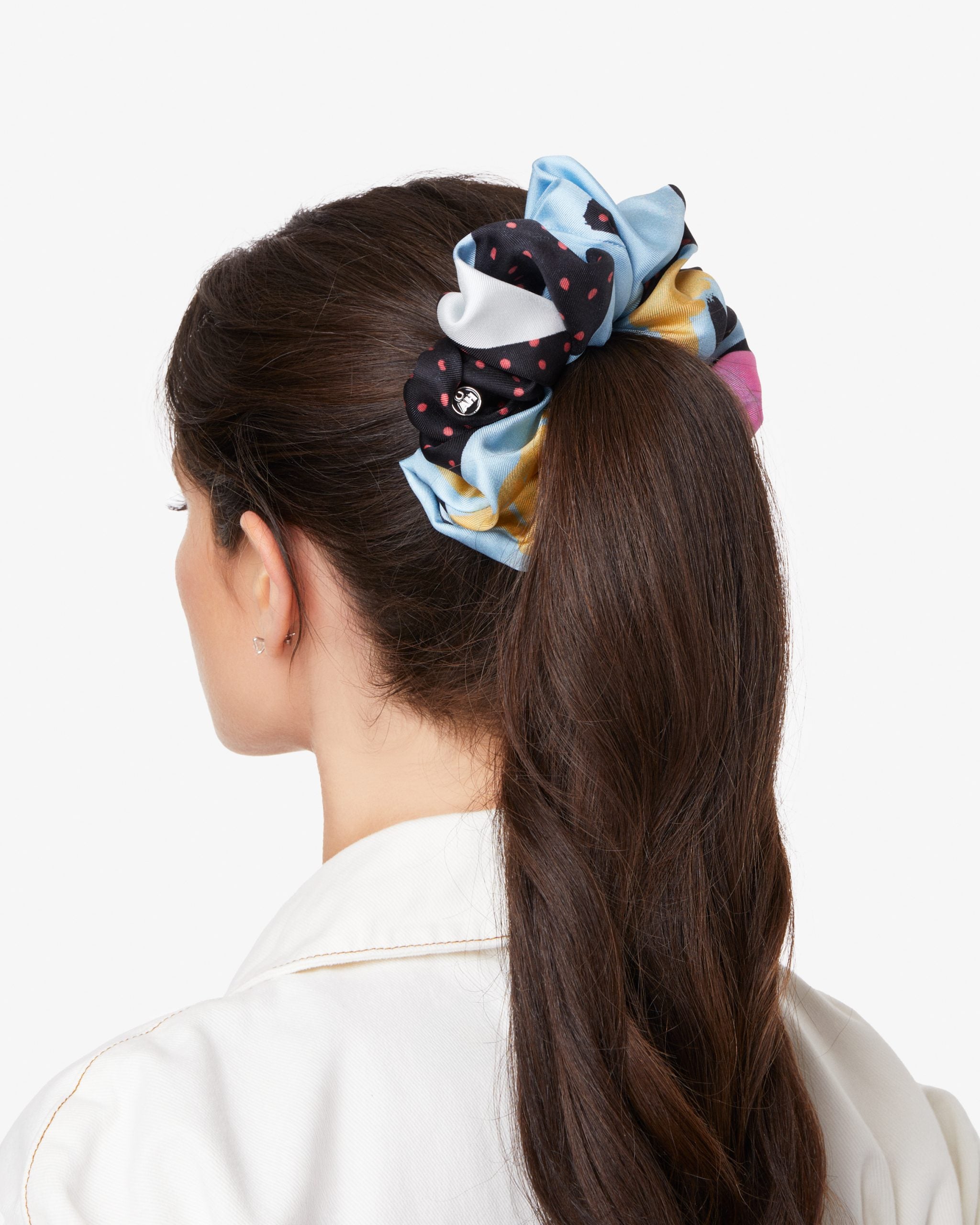 The Symi Sea Scrunchie is a colourful and vibrant hair tie in an abstract blue print created in collaboration with esteemed Greek artist Alexandra Manousakis. Made from a luxurious silk twill, this band is suitable for all hair types. Adorned with our signature AH enamelled logo.