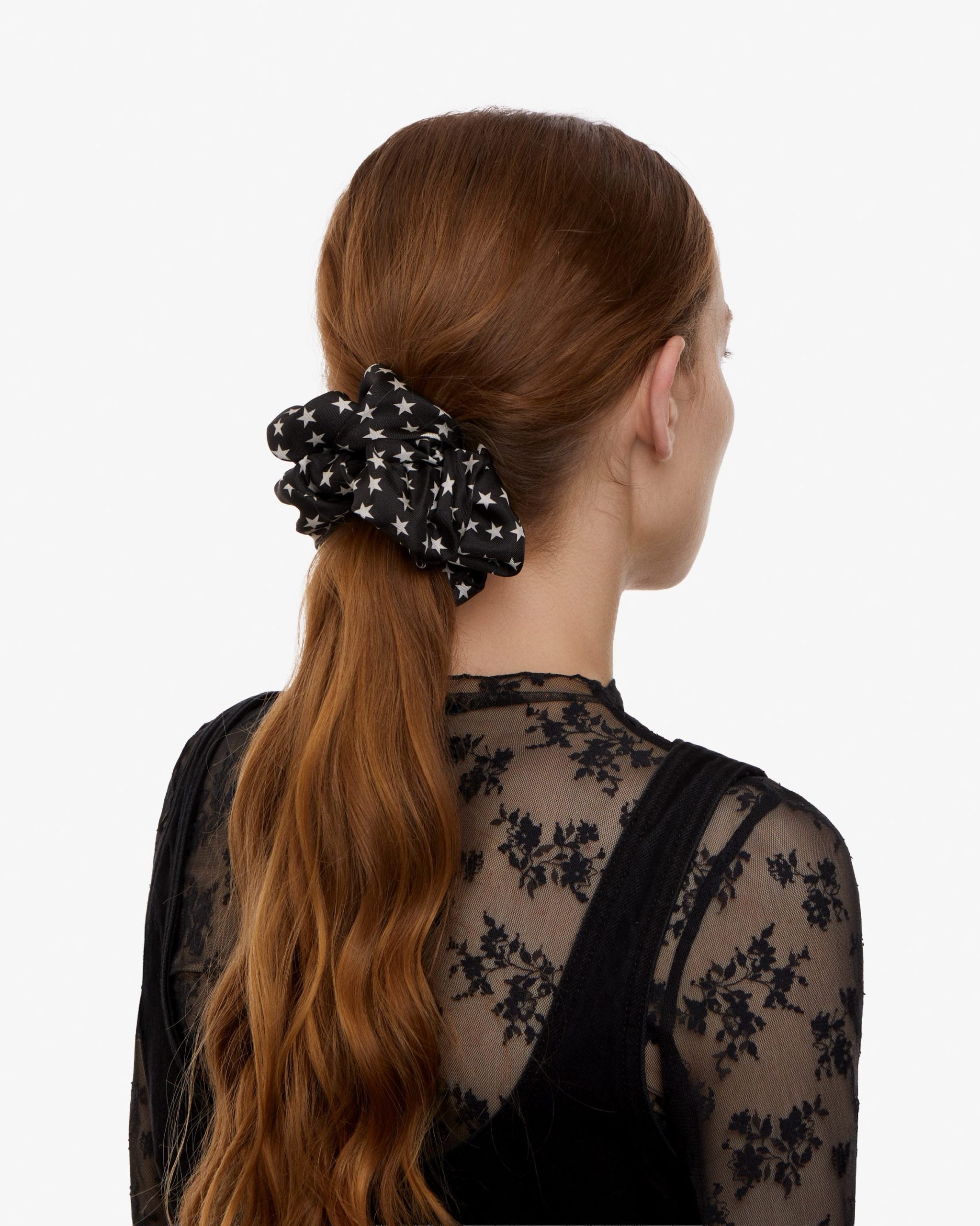The graphic and striking What A Star Scrunchie is a timeless and versatile hair tie in silk. A multitude of chalk white stars sit uniformly on a black background. Made from a luxurious silk twill, this band is suitable for all hair types. Adorned with our signature AH enamelled logo.
