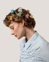 Designed to be worn on the right side, perched down close to the face so the hat touches the forehead. An elastic which tucks around the back of the hair and a metal comb secure the piece in place.