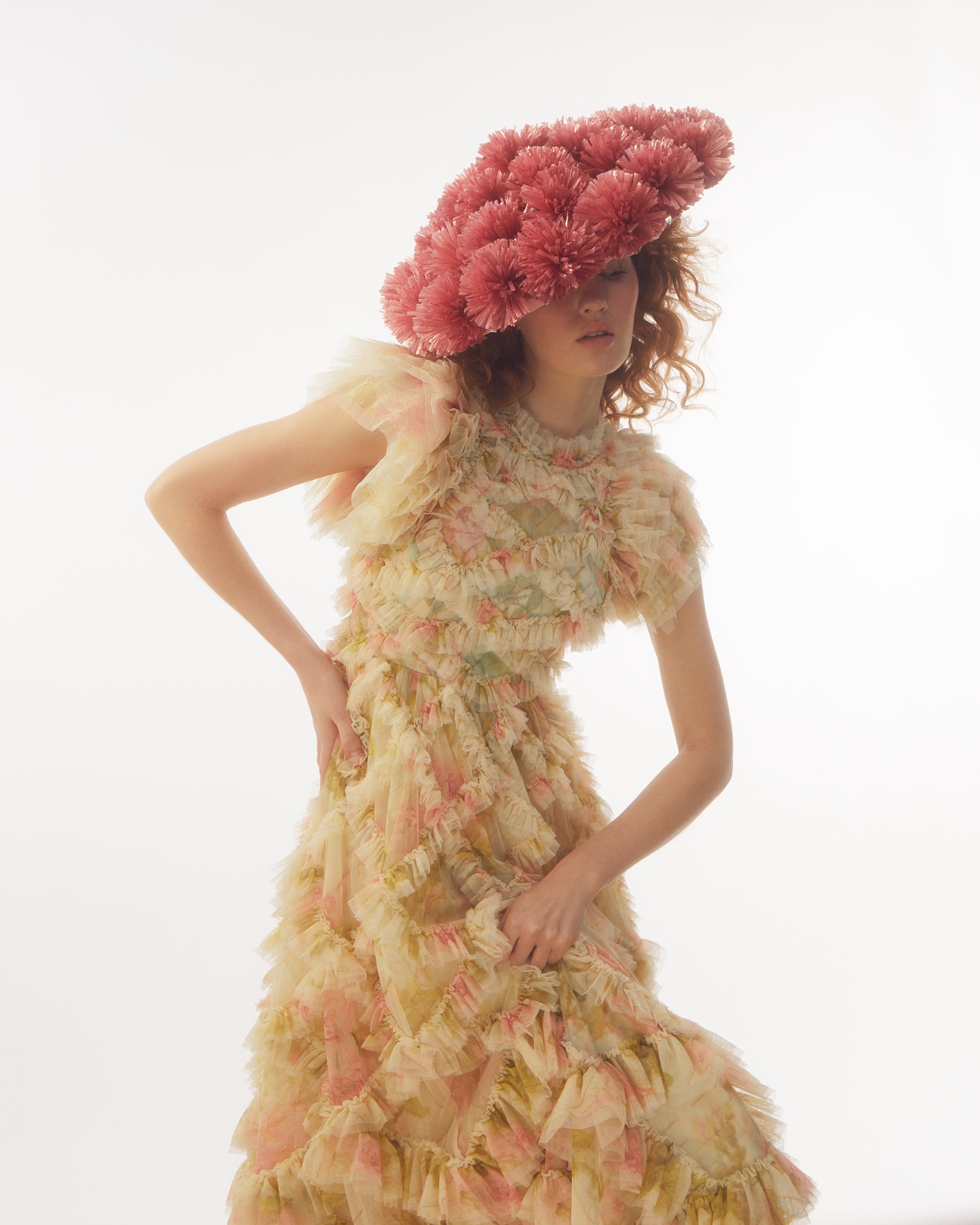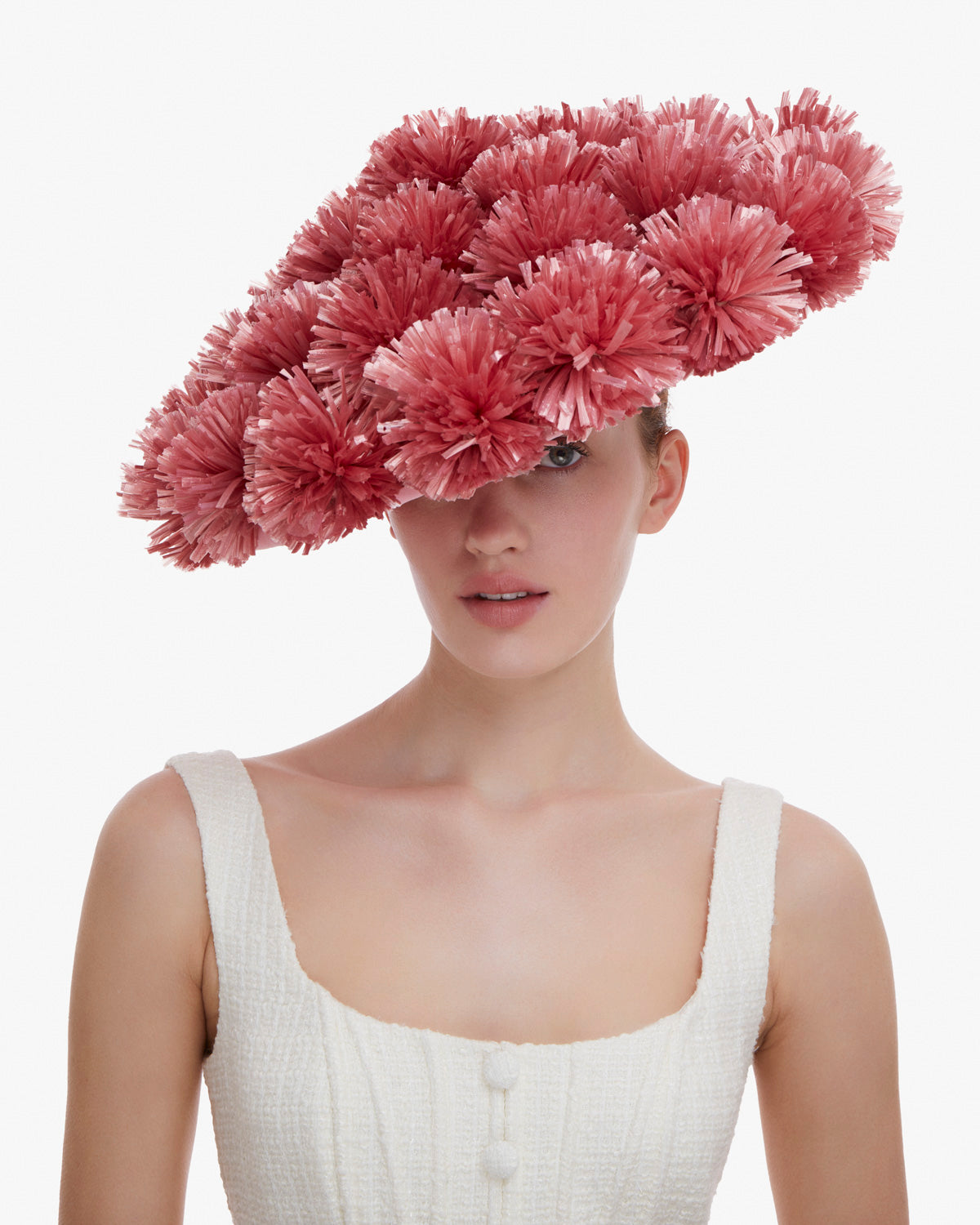 The In Someone Else’s Shoes Hat is a large hat in rose pink. The sweeping pink base is covered in tufts of rose raffia for a vintage feel. This is a substantial hat, supported from beneath by a smaller headpiece to keep the whole hat solid and secure. Lined in our signature woven jacquard and adorned with our AH enamelled logo.