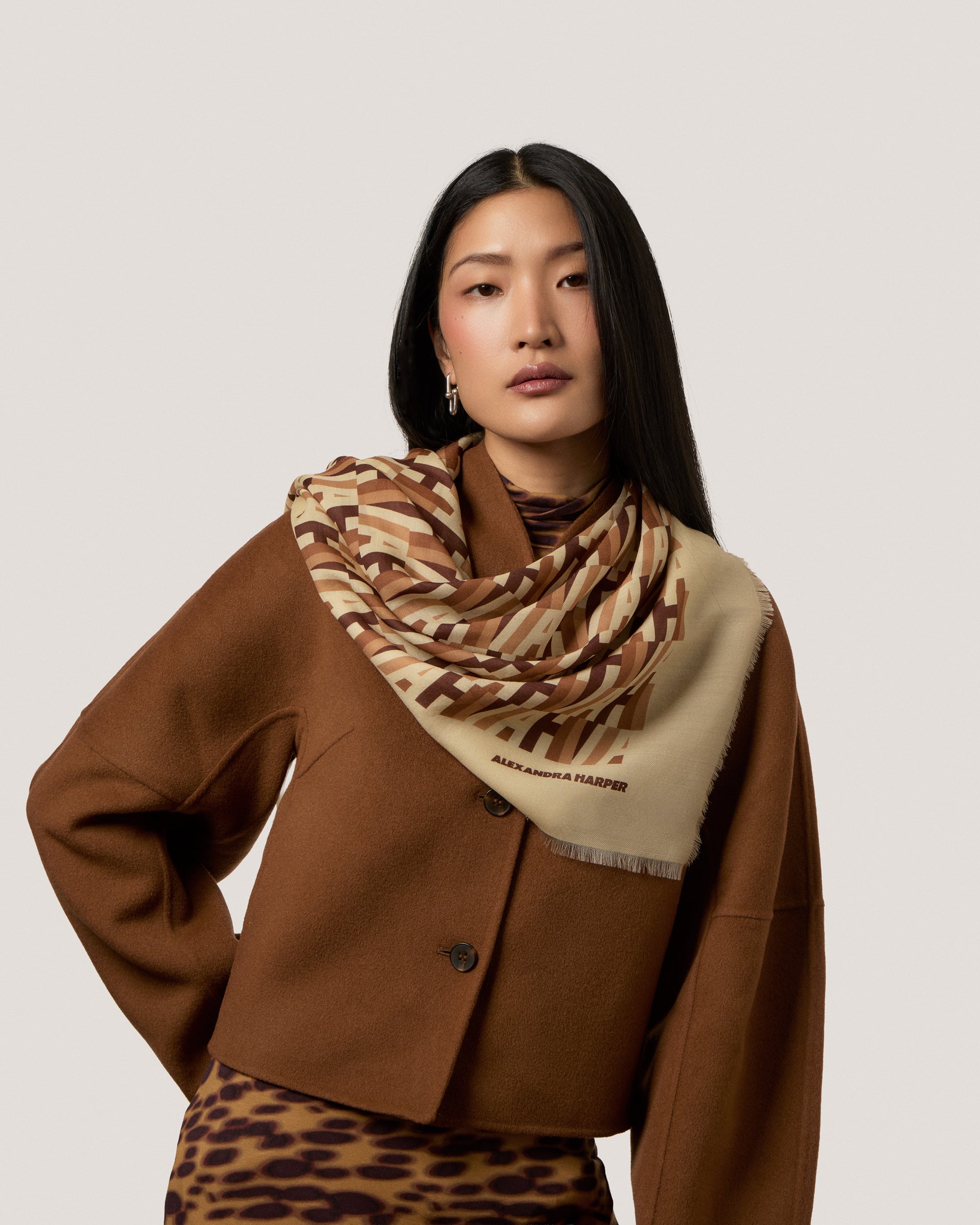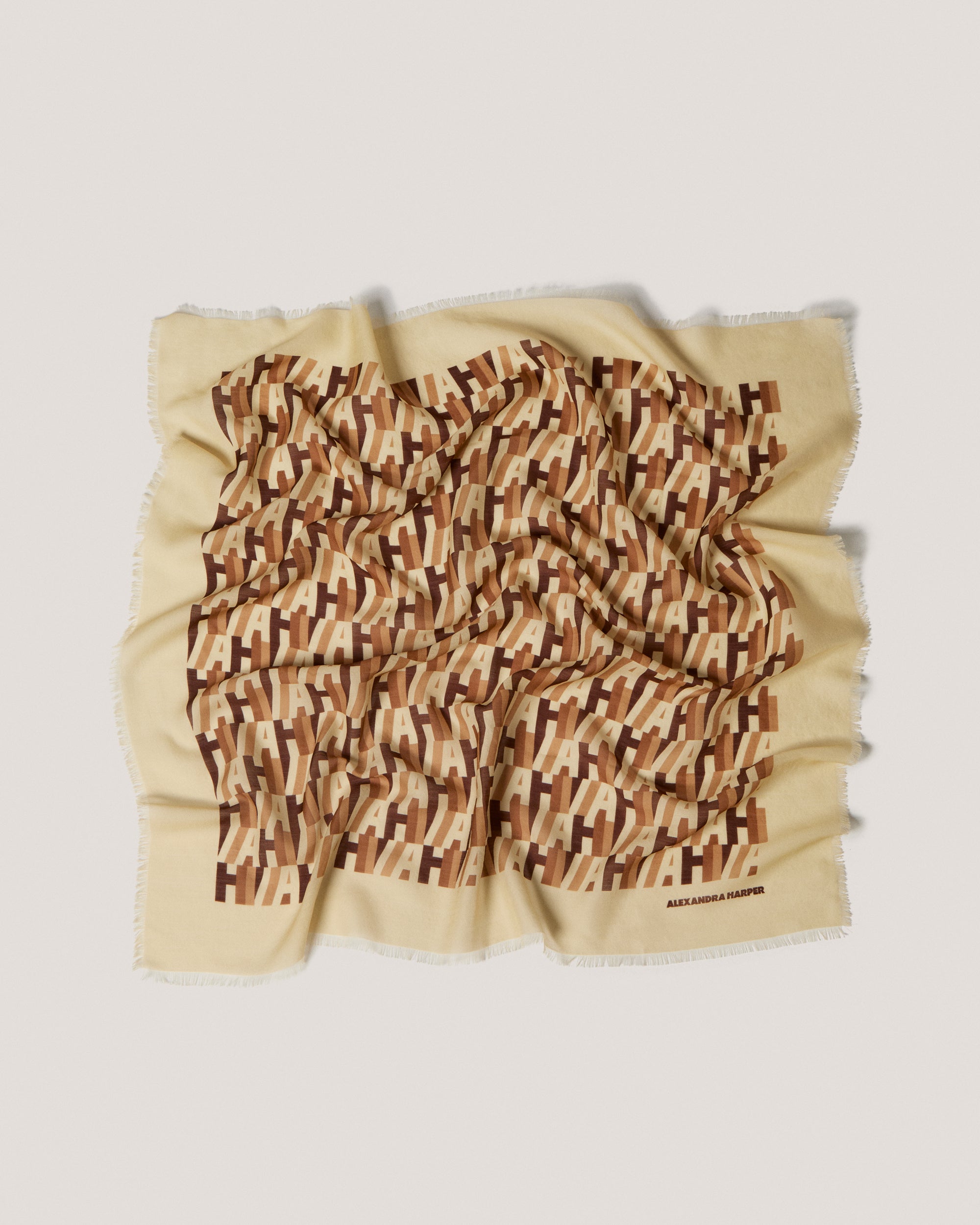 The AH Signature Print Wool Blend Scarf is a modern and chic accessory in tones of brown and cream. Adapting our in-house logo into this gorgeous contemporary print, this scarf is versatile, luxe and timeless. Printed in England and made from a wool and silk blend, it’s a perfect weight for cooler weather. Adorned with our AH enamelled logo.