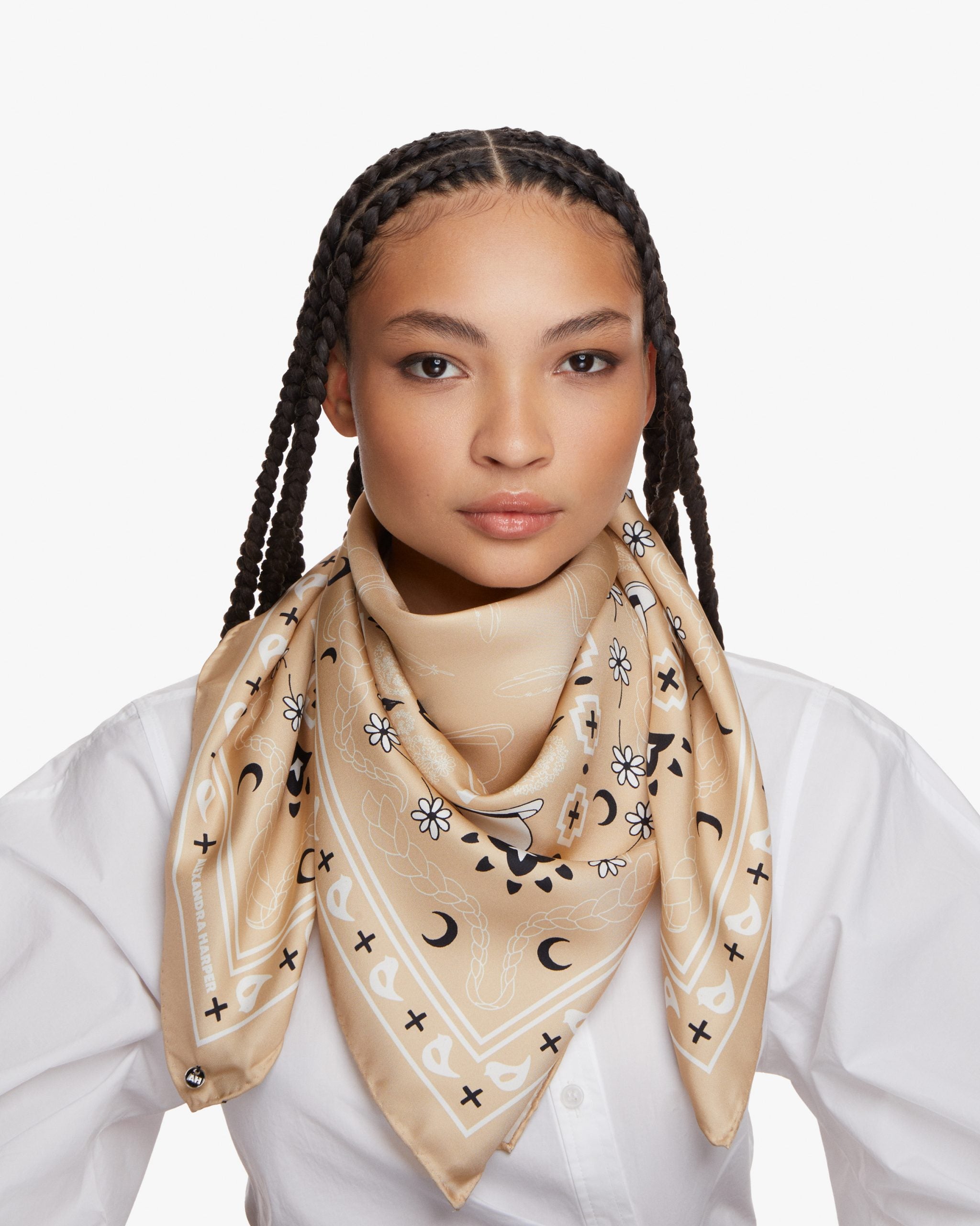 The Bandana Print Silk Scarf is a luxurious and fashion forward take on an original bandana concept. Millinery motifs such as hats, feathers, flowers and plaits give new life to a much-loved design, in tones of cream, white and black. Pure silk twill printed in England, completes this luxurious accessory. Adorned with our AH enamelled logo.