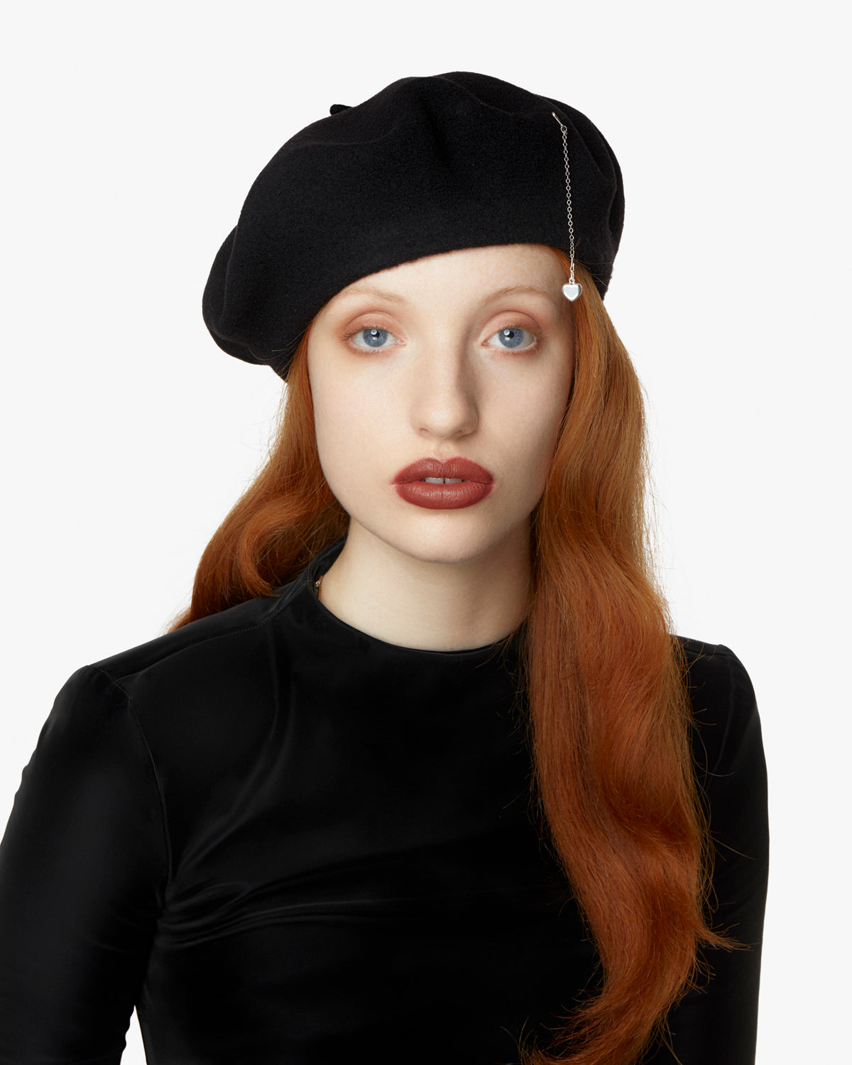 The Tender Heart Wool Beret is a classic beret made in France and trimmed in the Atelier with a delicate chain brooch and beautiful heart charm. Made in a black merino wool this comfortable hat i perfect for any occasion, day or night. This traditional style is sophisticated and versatile and comes adorned with our signature AH enamelled logo.