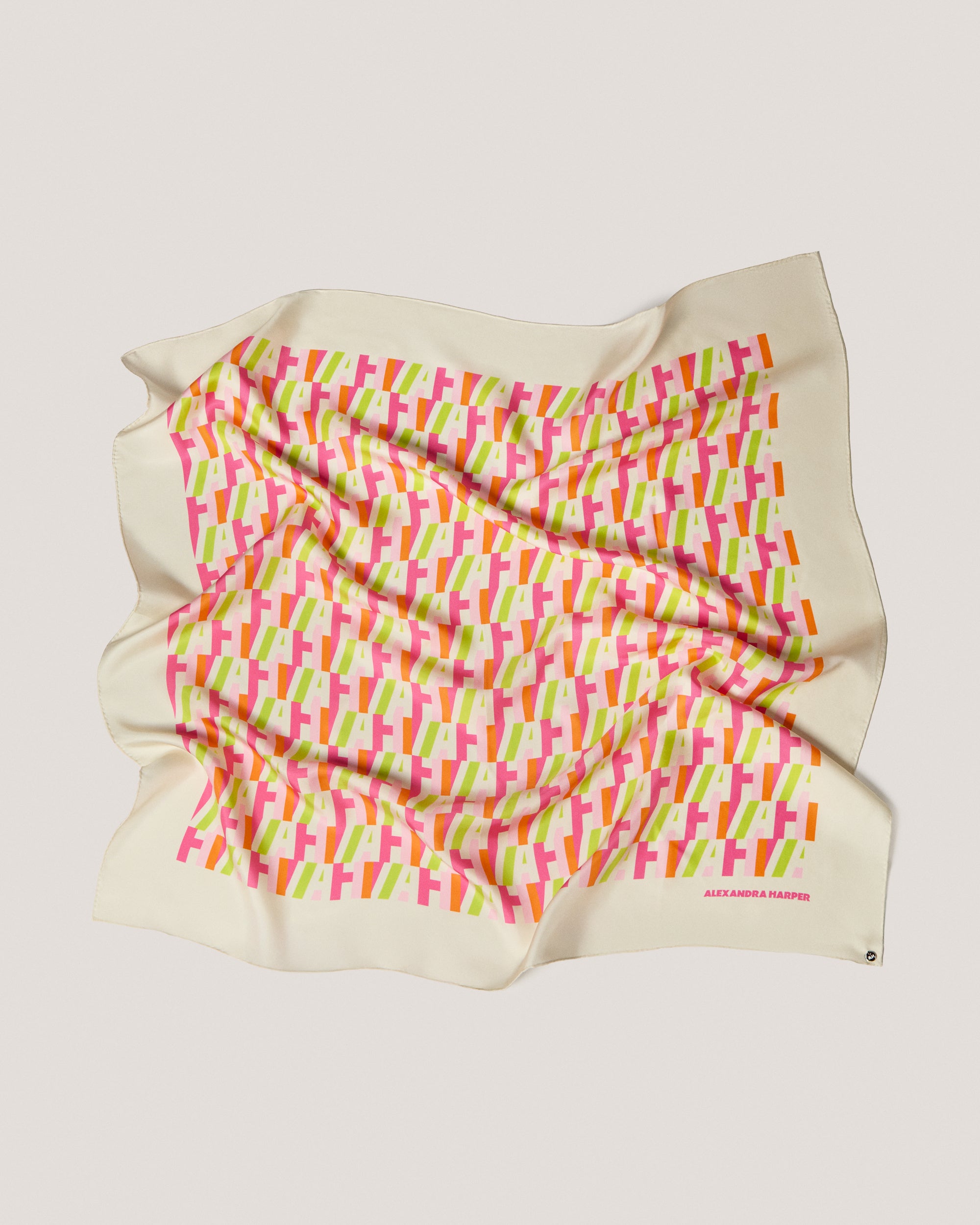 The AH Signature Print Silk Scarf is a modern and chic accessory in tones of pink, green, orange and cream. Adapting our in-house logo into this gorgeous contemporary print, this silk scarf is versatile, luxe and timeless. Made from pure silk twill and printed in England, this high-quality scarf comes complete with our AH enamelled logo.