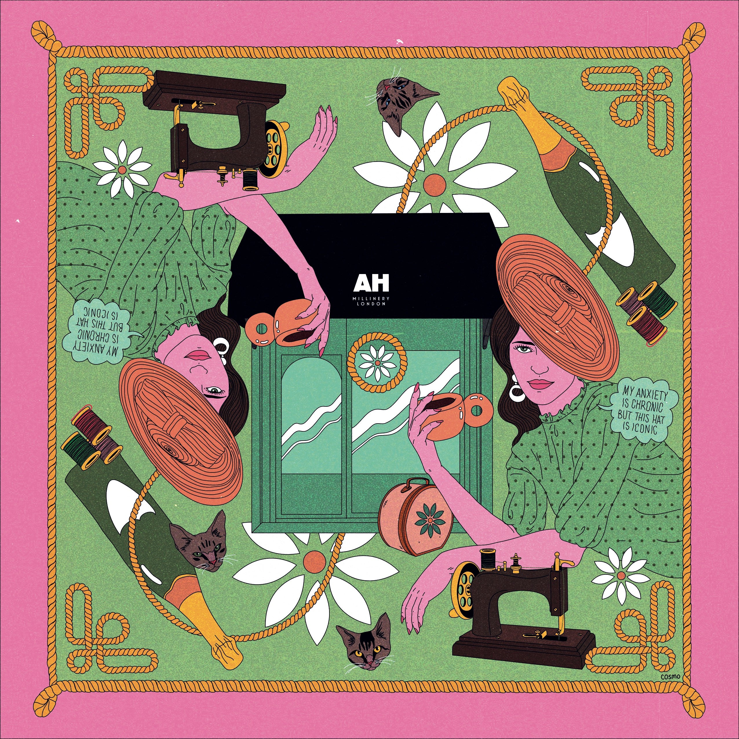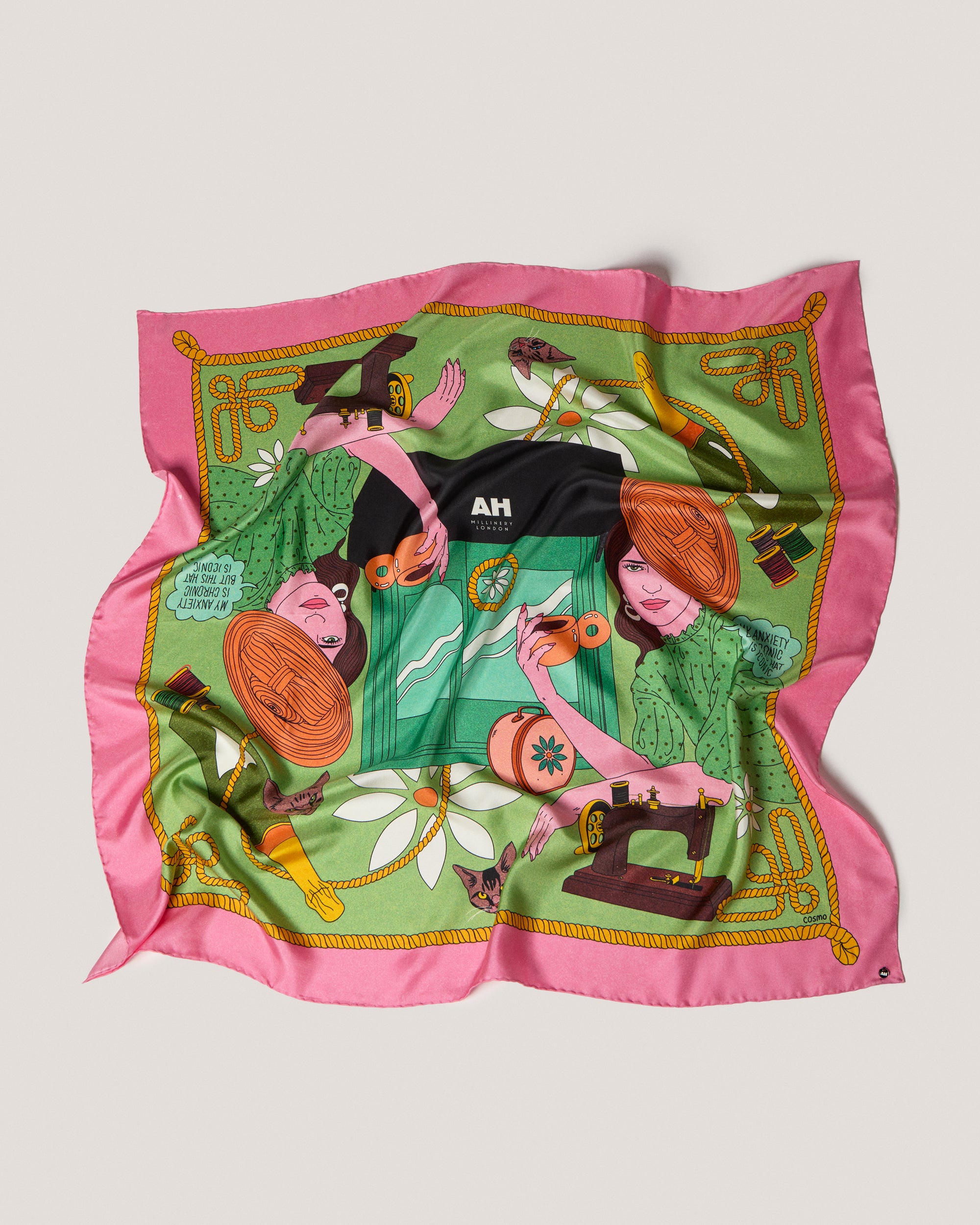 Designed with celebrated artist Cosmo Danchin- Hamard, this gorgeous pink and green silk scarf was made to celebrate the AHM Atelier. With our jewel-box location flanked by #AHMillineryGirls, the vibrant design pulls together elements of the store, the production of hats and Alexandra’s beloved felines. Adorned with our signature AH enamelled logo.