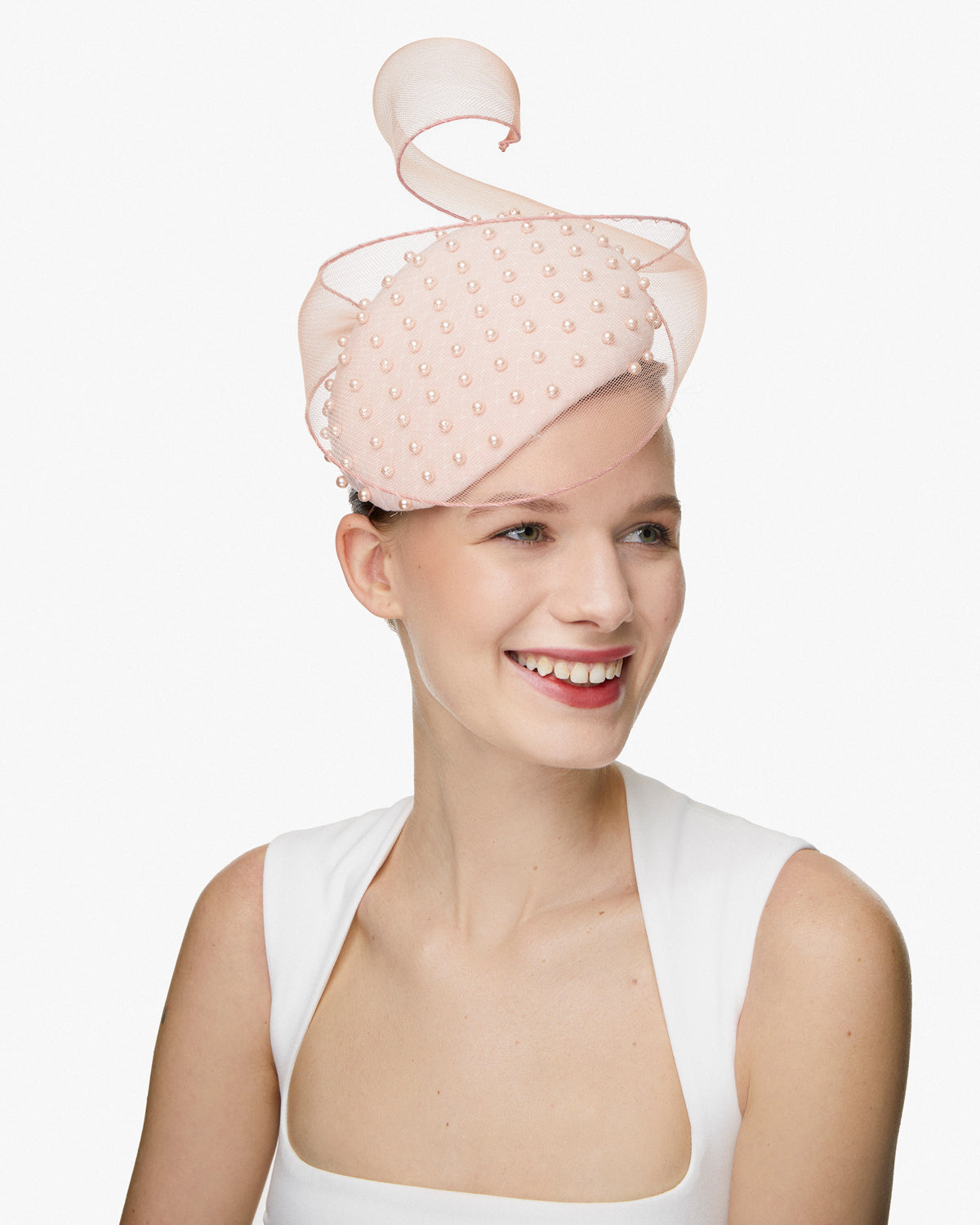 The Alush Hat is a subtle and stylish headpiece in a neutral, light dusty pink. A dramatic crinoline swirls sits on a nude pink base that is hand beaded with pink faux pearls. The headpiece base is a side-beret style and is covered in a beautiful matte fabric. Lined in our signature woven jacquard and adorned with our AH enamelled logo.