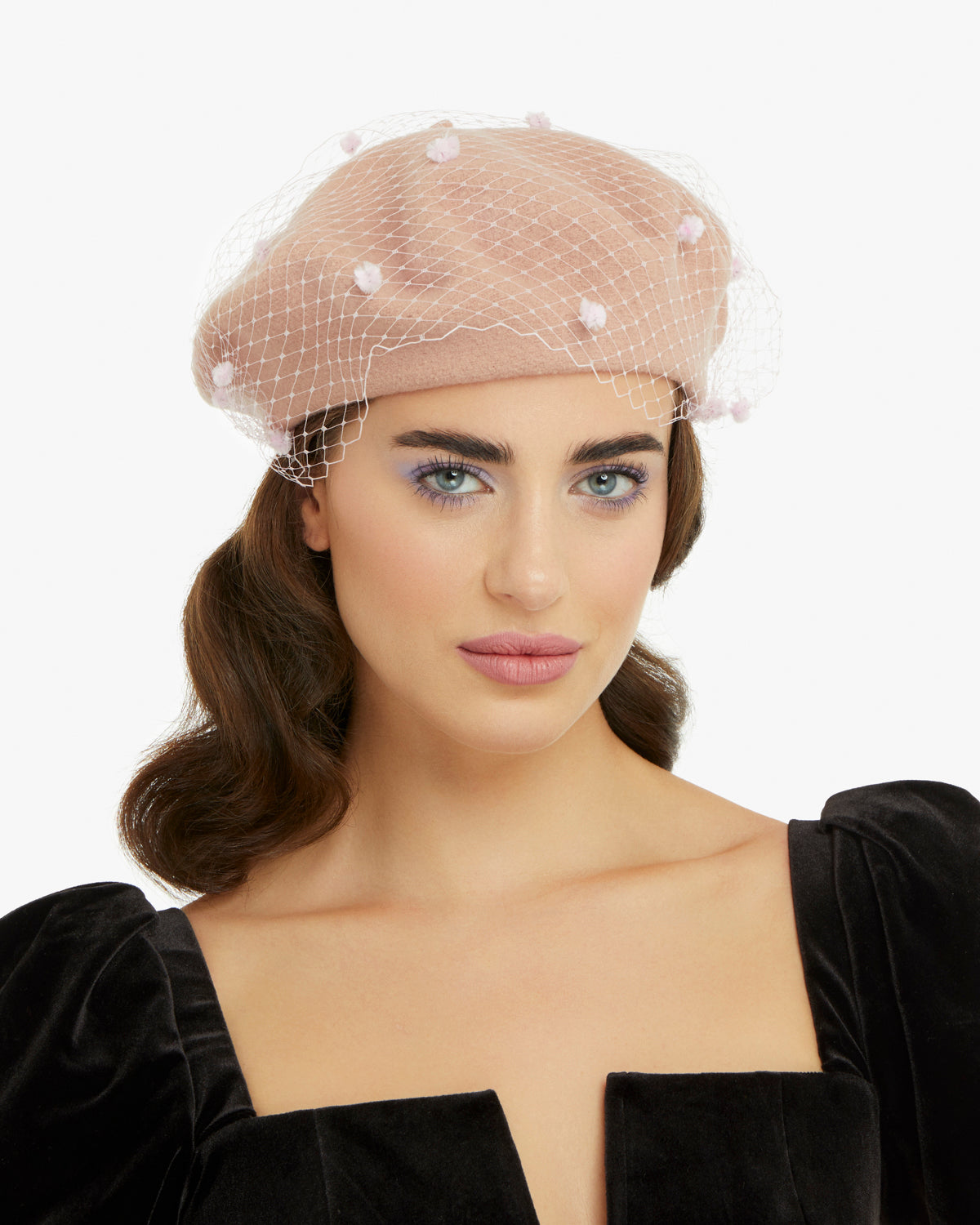 The Power Romance Wool Beret is a classic beret made in France and trimmed in the Atelier with a delicate waft of matching spotted veiling. Made in a dusty pink merino wool this comfortable hat is perfect for any occasion, day or night. This traditional style is sophisticated and versatile and comes adorned with our signature AH enamelled logo.