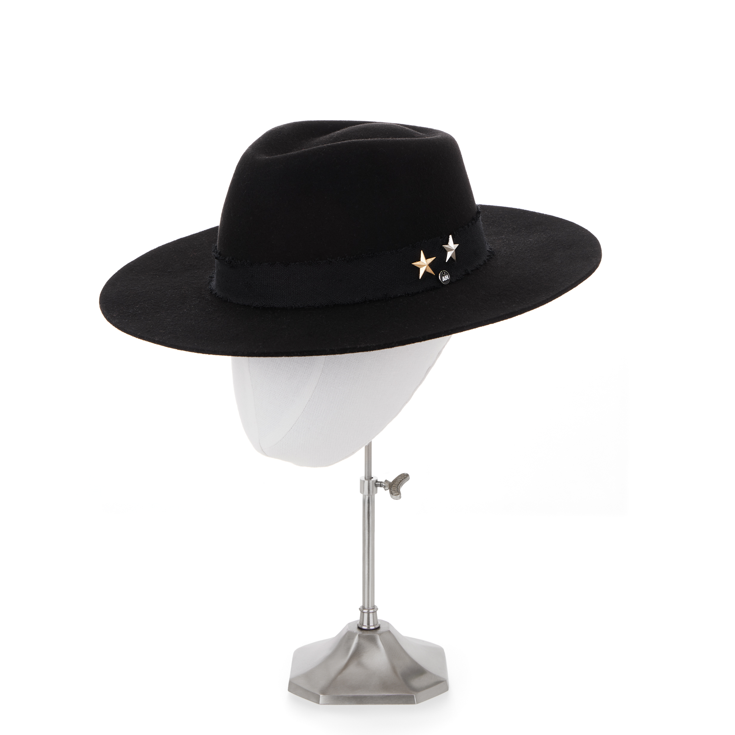 Presenting our new, gorgeous fedora in a high-performance luxury, black wool felt. Shaped by our trusted partners in the USA and finished to perfection in the AHM atelier – this gorgeous hat has a leather sweatband, and a raw silk trim adorned with silver and gold stars, this is THE hat for year-round style. A susbtantial, 200g western weight felt, this hat will last a lifetime – and will only get better looking with age!