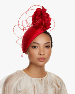 The Lonesome Rose Hat is a timeless and flattering headpiece in red. Gorgeous embroidered brocade lines a disc-like shape and on top sit vibrant and handmade silk blooms. This hat is supported from beneath by a smaller headpiece to keep the whole hat solid and secure. Lined in our signature woven jacquard and adorned with our AH enamelled logo.
